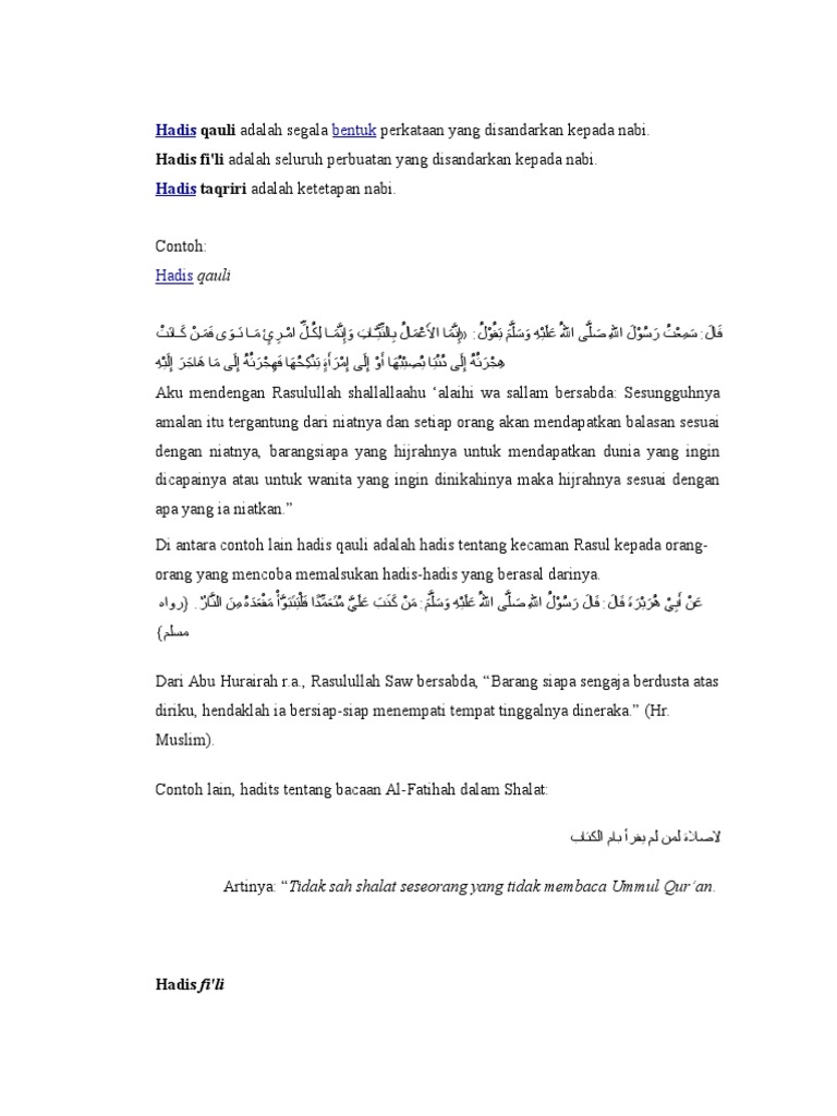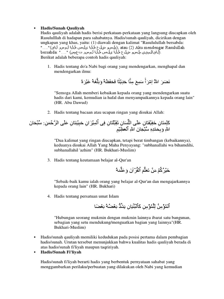 Harokat akhir ketiganya berubah ubah sesuai denga amil yang memasukinya. Dilihat dari tingkatannya sunnah qauliyah menempati urutan pertama yang berarti kualitasnya lebih tinggi dari kualitas sunnah filiyah maupun taqririyah. Contoh lainnya dapat pula dilihat. Dalam hadits tersebut terdapat berita tentang perbuatan nabi saw yang menjadi anutan perilaku para sahabat pada saat itu dan menjadi keharusan bagi semua umat islam untuk mengikutinya. Hadits tentang doa nabi muhammad saw. Dengan kata lain bahwa perbuatan atau tingkah laku tersebut bisa menjadi pedoman atau tuntunan cara melakukan suatu.