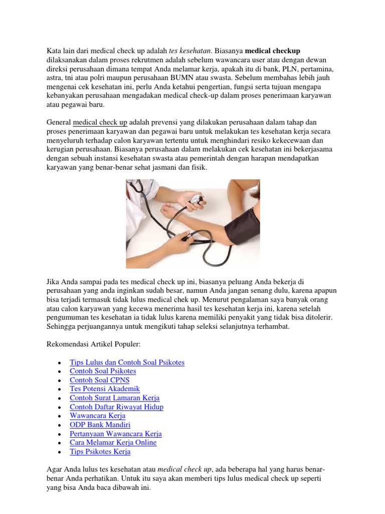 Contoh hasil medical check up perusahaan. Contoh hasil medical check up perusahaan sangatlah penting dilakukannya medical check up secara berkala tidak hanya dilakukan orang yang memiliki tubuh yang sehat saja. Contoh hasil medical check up bisa menjadi gambaran bagi anda mengenai kondisi kesehatan tubuh yang sedang terjadi pada seseorang. Dalam beberapa kondisi cek medis secara menyeluruh wajib untuk dilakukan pekerja atau pegawai perusahaan seperti calon pegawai yang mengikuti seleksi perusahaan atau persiapan pensiun. Penyajian rekapitulasi hasil medical check up yang diinginkan klien penyajian hasil medical check up merupakan akhir dari alur medical check up karyawan. Jika hasil medical check up kita baik maka kita lolos jika ada masalah dengan kesehatan kita tentu perusahaan tidak mau menerima. Mengapa demikianpara pengusaha tidak mau mengeluarkan uang lebih untuk medical check up calon karyawannya dengan alasan untuk menghemat pengeluaran budget perusahaannamun sebenarnya yang dilakukan pengusaha tersebut justru menjerumuskan dirinya sendiri.