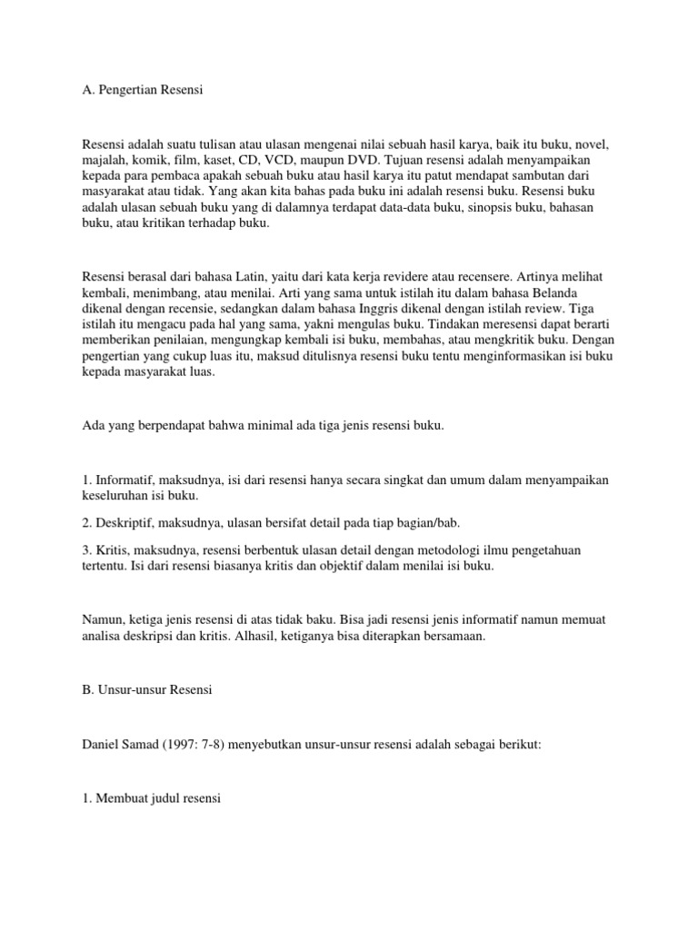 Contoh hasil resensi buku. Tujuannya untuk membantu mereka yang ingin mengetahui seluk beluk metodologi penelitian prosedur penelitian dan desain penelitian yang secara umum dapat digunakan dalam penelitian ilmu social. Contoh resensi buku kamu sedang mencari informasi perihal resensi buku untuk tugas sekolah atau ingin belajar mengenai cara meresnsi yang baik dan benar beserta contoh resensinya. Resensi berasal dari bahasa latin recensio recensere atau juga revidere yang artinya mengulas kembaliresensi adalah suatu penilaian terhadap sebuah karya karya yang dinilai dapat berupa buku dan karya seni film dan drama. Contoh resensi buku ilmiah buku ini adalah buku yang disusun berdasarkan pandangan dan pemikiran dari sejumlah peneliti dan pakar dalam bidang metodologi penelitian. Pada artikel ini kita akan membahas lengkap mengenai pengertian resensi beserta contoh resensi buku non fiksi. Dalam kbbi resensi adalah ulasan dari sebuah buku.