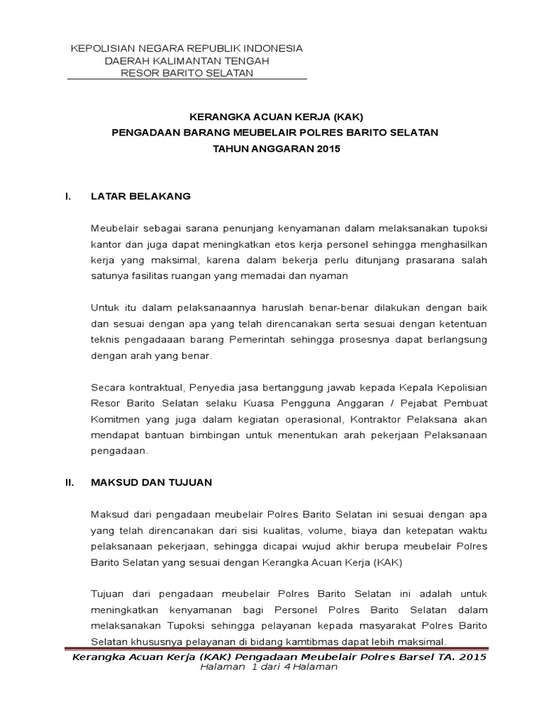 12 nama paket dan uraian singkat lingkup pekerjaan sebagaimana tercantum dalam ldp. 20 contoh kerangka acuan kerja kak pengadaan barang dan jasa dari berbagai jenis pekerjaan kerangka acuan kerja atau juga disebut term of reference tor pengadaan barang adalah suatu dokumen yang menginformasikan gambaran latar belakang tujuan ruang lingkup dan struktur sebuah proyek pengadaan barang yang telah disusun oleh skpd dinas terkait.