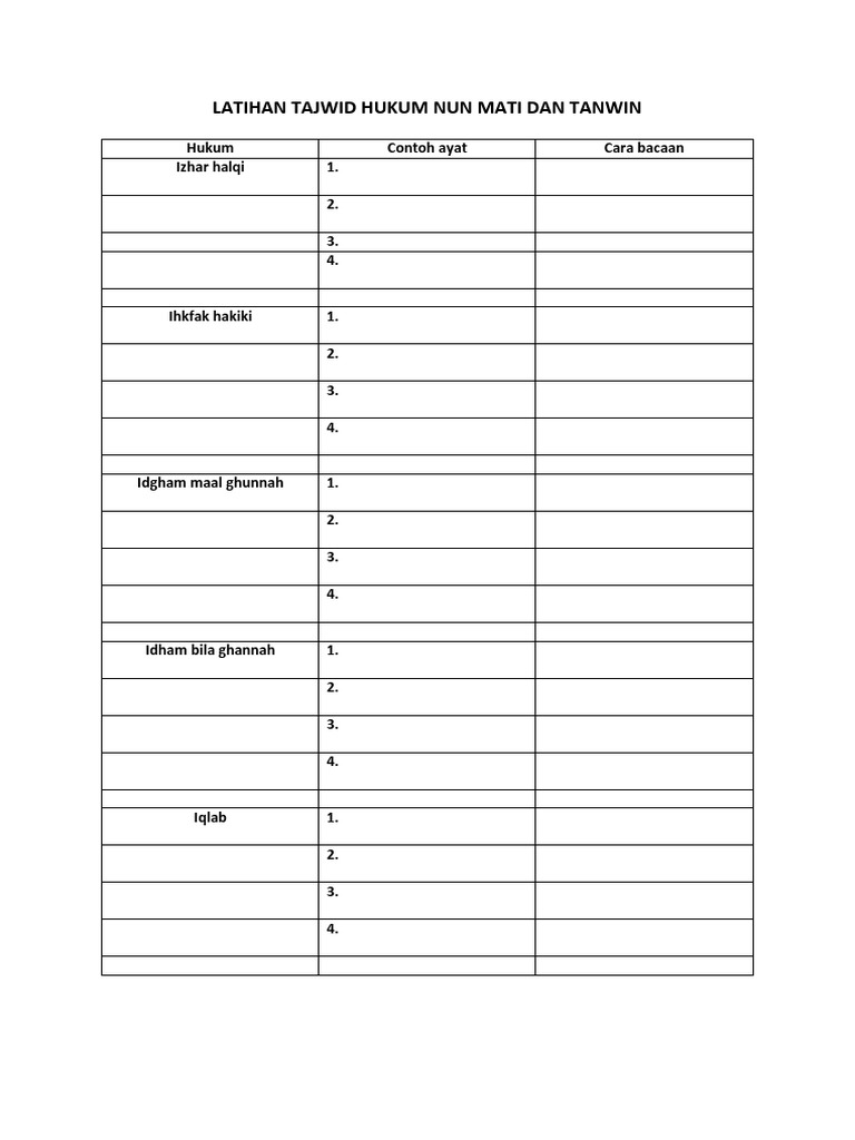 Contoh hukum bacaan izhar. Dalam mempelajari ilmu tajwid anda harus sering membaca dan memperhatikan satu persatu hurufnya dengan tertib dan teliti dibiasakan untuk membaca dengan tartil. Ayat ayat tersebut biasanya dipakai sebagai bacaan dalam shalat fardu karena ukuran ayatnya yang pendek. 12 hukum bacaan tajwid dan contohnya pembahasan lengkap didalam al quran terdapat hukum bacaan tajwid yang harus sesuai jika dilantunkan. Berikut ini kami akan menjelaskan pengertian dan contoh izhar syafawi dengan lengkap untuk lebih jelasnya simak pembahasan dibawah ini. Izhar yaitu mengeluarkan huruf dari mahrajnya tanpa berdengung. Contoh contoh dari hukum idzhar halqi diatas kami ambil dari surat surat pendek juz amma dan juga beberapa surat dalam al quran supaya kita semua dengan mudah mempelajari tentang hukum nun mati dan tanwin khususnya idzhar halqi.