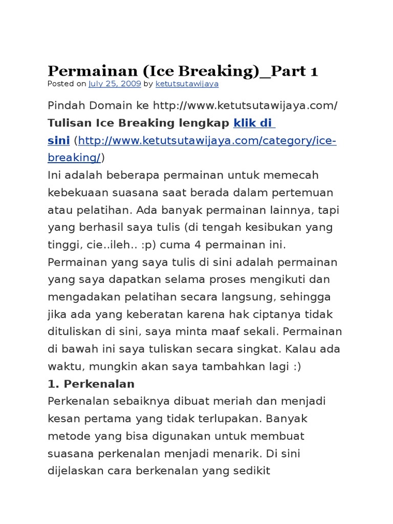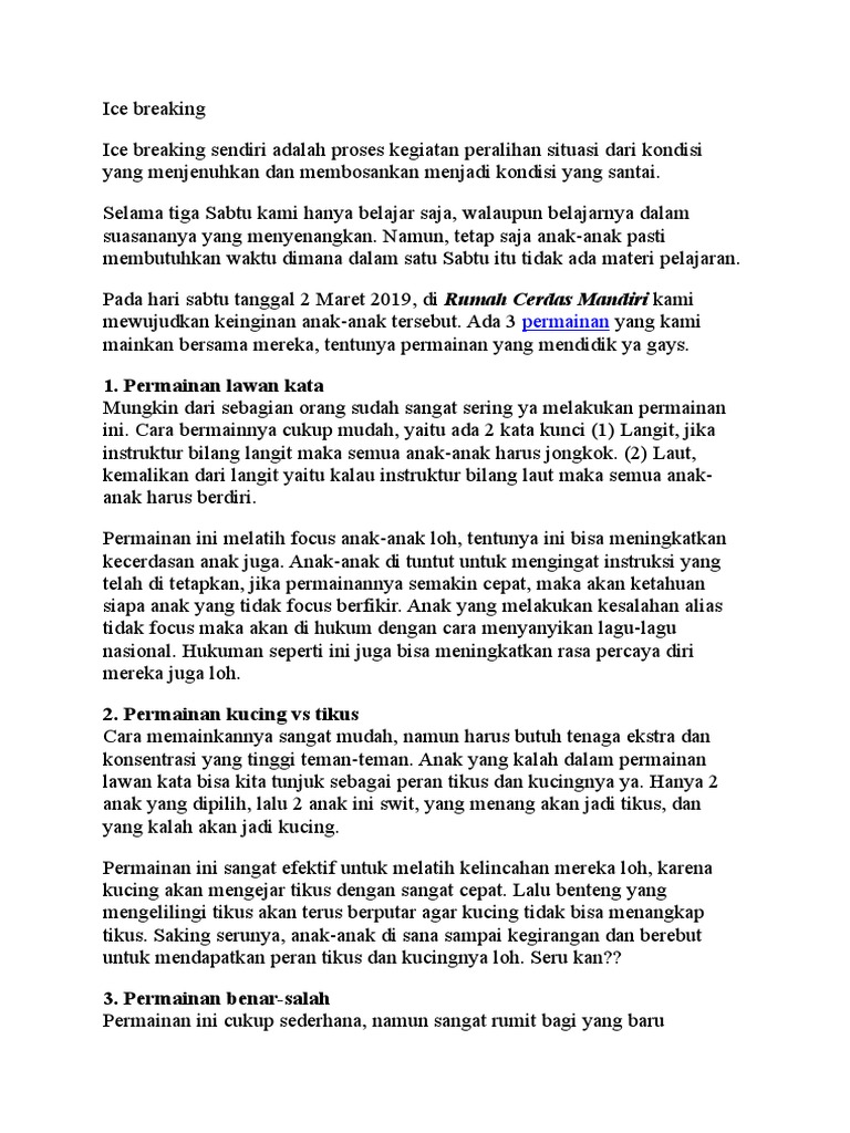 Cara memainkan permainan ice breaking. Dua pernyataan harus benar dan yang satunya lagi adalah kebohongan. Tapi menurut pendapat saya no 12 bisa dikerjakan jika telah menyelesaikan no 10 seperti intruksi di no 11 sementara no 10 tidak dikerjakan jadi no 12 juga tidak bisa dikerjakan. Contoh ice breaking sederhana. Game ice breaking lucu ice breaker secara bahasa terdiri dari kata ice yang berarti es dan breaking yang berarti memecah. Tidak seperti game pada umumnya ice breaking bisa sangat sederhana.
