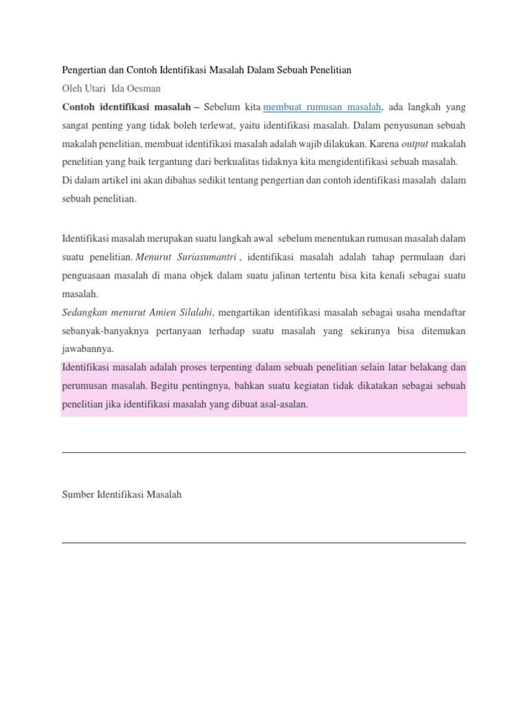 Identifikasi masalah sebagai bagian dari proses penelitian dapat dipahami sebagai upaya untuk mendefinisikan masalah problem dan membuat defiisi tersebut bisa diukur measurable sebagai langkah awal penelitianidentifikasi masalah menyediakan platform untuk menyelidiki berbagai intervensi dan menghasilkan opsi. Karena output makalah penelitian yang baik tergantung dari berkualitas tidaknya kita mengidentifikasi sebuah masalah. Dengan kata lain identifikasi masalah adalah salah satu proses penelitan yang boleh dikatakan paling penting di antara proses lain. Bagi kamu yang saat ini sedang sekolah atau kuliah pasti menyusun sebuah makalah proposal atau penelitian menjadi kegiatanmu sehari hariapalagi bila kamu mengikuti organisasi kepenulisan atau ukm karya tulis ilmiah di. Jadi untuk lebih jelasnya mari kita simak bersama. Contoh identifikasi masalah berikut ini rangkuman makalah materi tentang identifikasi masalah yang dibahas mulai dari pengertian jenis fungsi strukturunsur jurnal tujuan ciri makalah peran makna konsep identifikasi masalah secara lengkap.