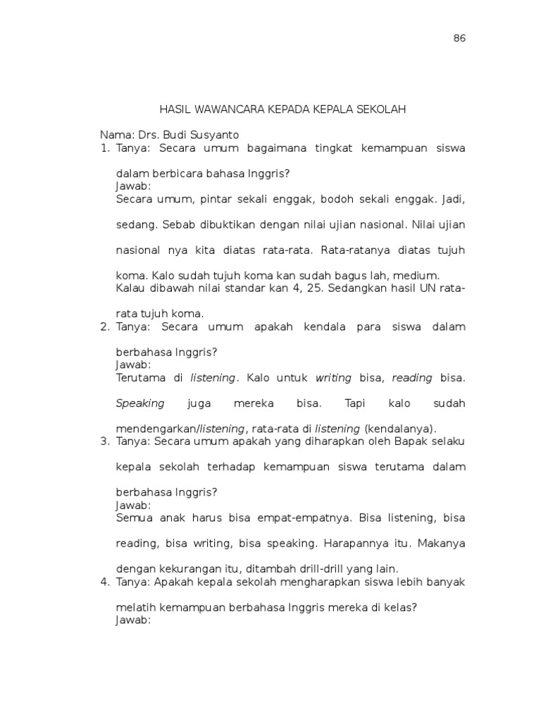 Contoh interview bahasa inggris di sekolah. 5 contoh percakapan bahasa inggris singkat dalam interview kerja hai sahabat sbi yang super dalam tes masuk kerja kita sering menemui tahapan interview dimana kita akan diberikan bermacam macam jenis pertanyaan yang bertujuan untuk menguji skill dan kemampuan sebagai seorang karyawan yang layak. Nah salah satunya dengan mempelajari percakapan dibawah ini. Umumnya mereka mensyaratkan pelaksanaan interview dengan bahasa inggris karena sekalipun pabrik atau perusahaannya berada di sini tapi rekan bisnis dan pemasarannya masih dilakukan ke luar negeri dalam hal ini. Interview bahasa inggris di sekolah wawancara adalah metode yang berguna untuk menyelidiki masalah secara mendalam menemukan bagaimana individu berpikir menginformasikan pengambilan keputusan serta menyaring layak tidaknya seseorang masuk dalam kriteria yang diperlukan. Perbanyak membaca agar pengetahuan anda dapat lebih terasah. Namun sebelum baca lebih lanjut kamu bisa baca contoh perkenalan bahasa inggris saat interview.