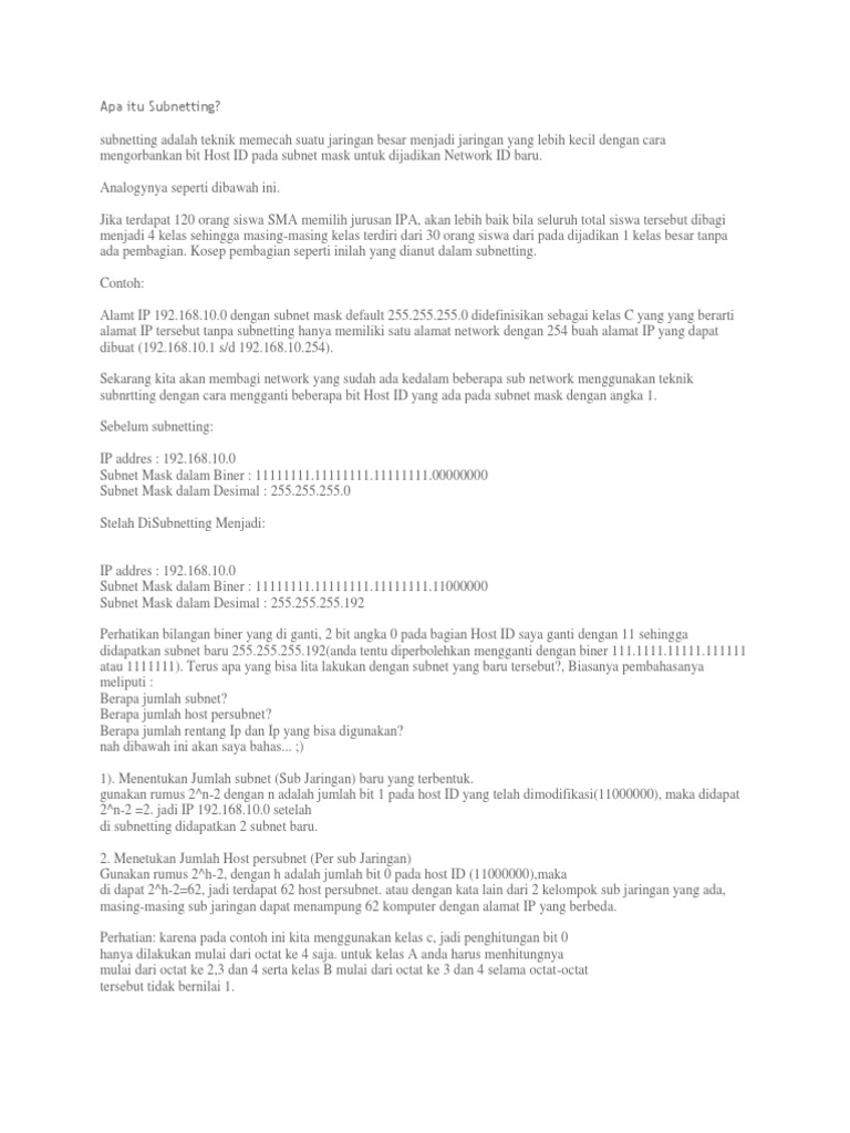 Jika kelas c berarti di oktet keempat terakhir kelas b di oktet ketiga dan keempat 2 oktet terakhir dan jika kelas a berarti di oktet kedua ketiga dan keempat 3 oktet terakhir. Dua bit ini dan bit berikutnya 16 bit pertama merupakan network id. Jumlah host per subnet 2y 2 dimana y adalah adalah kebalikan dari x yaitu banyaknya binari 0 pada oktet terakhir subnet. Ip address dibagi ke dalam lima kelas yaitu kelas a kelas b kelas c kelas d dan kelas e. Penulisan ip address versi 4 biasanya menggunakan notasi desimal bertitik yang terbagi menjadi empat oktet berukuran 8 bit sebagai contoh 19216811. Seperti yang telah kami jelaskan sebelumnya subnetting dilakukan agar pemakaian ip address pada jaringan komputer menjadi efisien.
