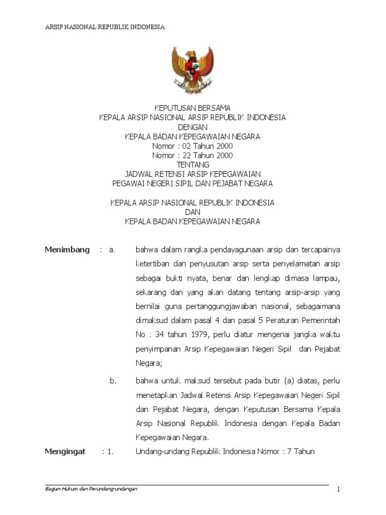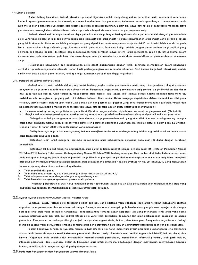 Contoh jadwal retensi arsip lengkap. Jadwal retensi arsip jra menurut undang undang nomor 43 tahun 2009 adalah daftar yang berisi sekurang kurangnya jangka waktu penyimpanan atau retensi jenis arsip dan keterangan yang berisi rekomendasi tentang penetapan suatu jenis arsip dimusnahkan dinilai kembali atau dipermanenkan yang dipergunakan sebagai pedoman penyusutan dan penyelamatan arsip. Arsip kacau adalah arsip yang tidak teratur disebabkan terjadinya percampuradukan antara arsip dengan non arsip berserakan tidak beraturan. Satu sisi bidang keuangan memerlukan bukti bukti akurat sisi lain pertumbuhan arsip keuangan berlangsung secara cepat. 31 kesimpulan jadwal retensi arsip merupakan komponen dari manajemen kearsipan yang menggambarkan jenis jenis arsip dari lembaga pencipta arsip creating agency dalam bentuk daftar yang berisi jangka simpan arsip yang terdiri dari jangka simpan aktif dan jangka simpan inaktif serta nasib akhir arsip yang meliputi musnah dinilai kembali atau permanen yang digunakan sebagai pedoman atau. Jadwal retensi arsip adalah ketentuan berapa lama suatu arsip harus disimpan sebagai arsip aktif arsip inaktif dan nasib akhir arsip yang bersangkutan musnah atau tidak musnah statis. Arsip sekolah indonesiapada kesempatan kali ini akan share tentang contoh arsip sekolah indonesia.