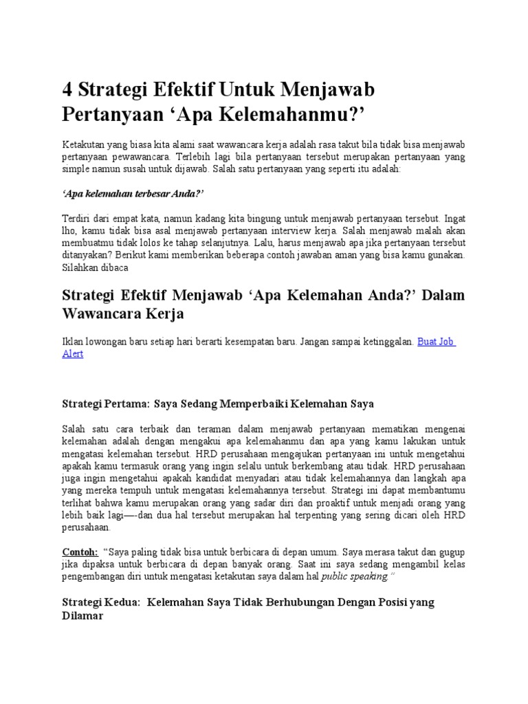 Contoh jawaban kelemahan diri dan cara mengatasinya. Dalam buku interview strategies that will get the job you want andrea kay mengatakan bahwa pertanyaan ini memang penuh jebakan. Sedangkan untuk kelemahan jutru abai dan tidak dipersiapkan sejak awal. Berikut beberapa contoh jawaban dari pertanyaan kelemahan dan kelebihan diri yang bisa kamu lihat untuk mendapat pemahaman tentang cara menjawab pertanyaan tersebut. Padahal jawaban ini paling di tunggu sebagai bentuk keyakinan bahwa anda manusia biasa dan mampu untuk memberikan perubahan. Agar tidak terjebak dengan pertanyaan seperti ini ikuti 4 tips jitu untuk menjawab kelemahan yang ada dalam diri anda dengan tepat agar memiliki nilai yang berkualitas di hadapan pewawancara. Jutek sama orang yang belum kenal 2.