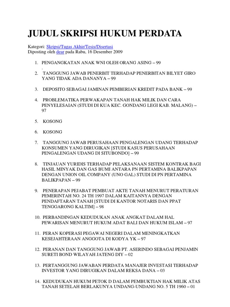 Contoh judul skripsi hukum perdata terbaru. Ada 250 contoh judul skripsi hukum lengkap terbaik yang bisa teman teman gunakan sebagai panduan mencari judul skripsi lengkap dan terbaik. Asas kepercayaan dalam transaksi jual beli online perspektif kuhperdata dan uu no 11 tahun 2008 tentang informasi dan transaksi elektronik. 49 ribu bagi anda yang berminat mendapatkan contoh skripsi hukum perdata silahkan pesan disini. Kumpulan 100 contoh skripsi hukum jurusan hukum keperdataan 1. Peranan lurah desa dalam sistem pemerintah desa menurut undang undang no32 tahun 2004 ttg pemerintah desa2006.