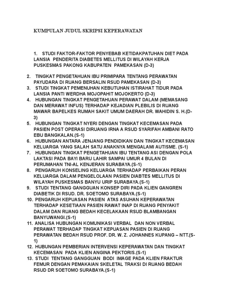 Judul skripsi keperawatan anak yang kami share berikut ini menjadi beberapa judul skripsi keperawatan yang kerap dipilih untuk diteliti sebagai prasyarat menyelesaikan program strata satu s 1 keperawatan. Contoh skripsi keperawatan untuk mendapatkan file lengkap dalam bentuk ms word mulai bab 1 sd.