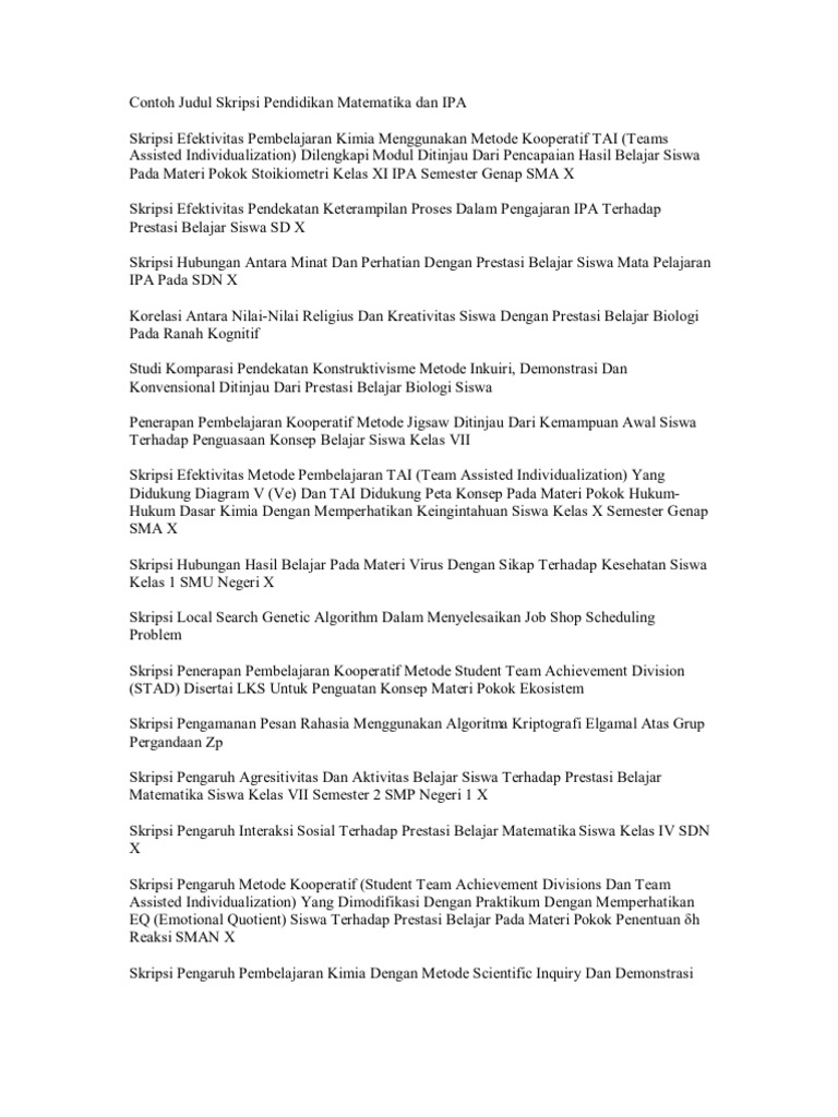 Daftar pustaka bukan pdf silahkan klik cara mendapatkan file atau klik disini. Oleh karena itulah pada tulisan ini akan membagikan tentang contoh judul skripsi matematika. Judul skripsi pendidikan matematika pmt untuk mendapatkan file lengkap dalam bentuk ms word mulai bab 1 sd. Buat temen temen yang lagi pada pusing mikirin judul skripsi khususnya judul skripsi jurusan matematikapendidikan matematika berikut saya kumpulkan judul judul skripsi yang mungkin bisa menjadi masukan dalam penelitian yang kalian akan lakukan. Berikut contoh contoh skripsi pendidikan matematika dalam bentuk ms word. Jurusan matematika terdiri dari dua jenis yaitu matematika murni dan jurusan matematika pendidikan.