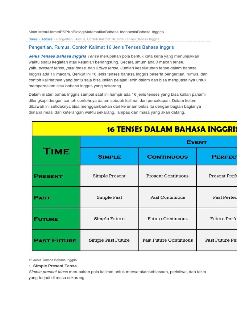 Past future tense berfungsi untuk menerangkan peristiwa atau aktifitas yang direncanakan di masa depan pada waktu yang telah berlalu. Tenses adalah salah satu bagian dari grammar yang sering kali membuat para pelajar bahasa inggris bingung bagaimana kapan harus menggunakannya. 16 tenses rumus dan contoh kalimat part 1 menguasai tenses dalam bahasa inggris sangat penting. Tense adalah bentuk kata kerja bahasa inggris untuk menunjukkan waktu. Inilah contoh 16 tenses in english beserta artinya. 16 tenses bahasa inggris lengkap dengan rumus penggunaan dan contoh kalimat dalam bentuk positif negatif dan interogatif serta tips memahami tenses tanpa menghafal.