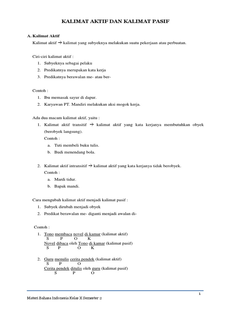 Ibu melipat baju. Ayah merasa kedinginan karena hujan turun sangat lebat. Kalimat aktif secara singkat pengertian kalimat aktif adalah kalimat yang subjeknya melakukan pekerjaan predikat. Karena tidak dilengkapi dengan objek maka kalimat aktif intransitif tidak dapat diubah ke dalam bentuk kalimat pasif. Kalimat aktif intransitif yakni merupakan jenis kalimat aktif yang tidak dilengkapi oleh objek kalimat namun disertai oleh kata keterangan atau pelengkap. Dengan kata lain kalimat ini bisa berdiri dengan subjek dan predikat saja tanpa adanya objek.