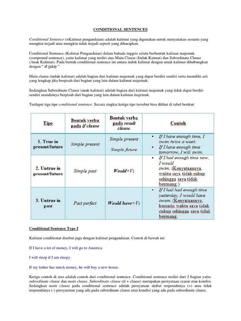 Jika jane tidak datang kamu harus mencarinya if the admission fee were cheap we could get inside. If i have free time i will go swimming. If i work hard i will have a lot of money. Jika saya datang cepat ke sekolah saya akan memberitahukanmu. If jane did not come you would go find her. Concluding sentence kalimat kesimpulan sentence and clause.