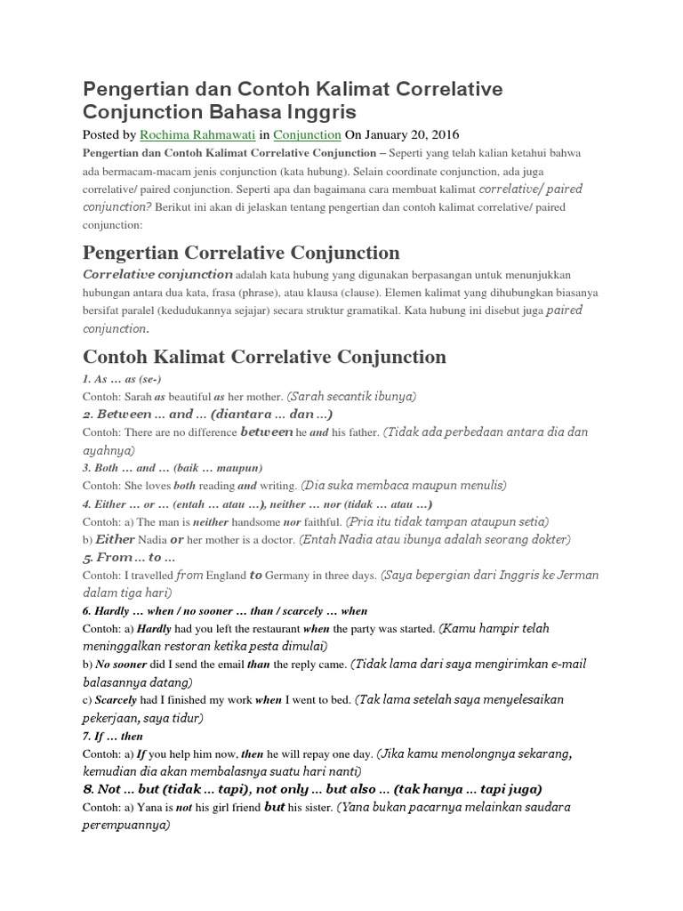 Either nisa or her mother is a scientist. John makes pancakes eggs and coffee for breakfast. Contoh kalimat correlative conjunction. Selain coordinate conjunction ada juga correlative paired conjunction. Correlative conjunction adalah kata penghubung yang digunakan berpasangan untuk menunjukkan hubungan antara dua kata frasa phrase atau klausa clause element kalimat yang dihubungkan biasanya bersifat parallel kedudukannya sejajar secara struktur garamatikal. Baik jane maupun aline tidak menyukai drama itu neither mom nor dad takes a bite on aunties cooking.
