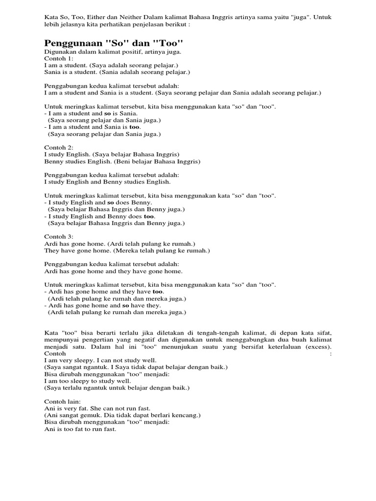 So dan too digunakan dalam kalimat positif. Penggunaan so too neither dan either. Either one of the girls would make it to the final. Rumus penggunaan either dalam kalimat bahasa inggris. Kata either merupakan sebuah kata yang digunakan pada kalimat negative yang berarti jugafungsinya adalah untuk menyatakan sebuah persetujuan negative. Saya juga tidak suka filmnya i dont want to eat either.