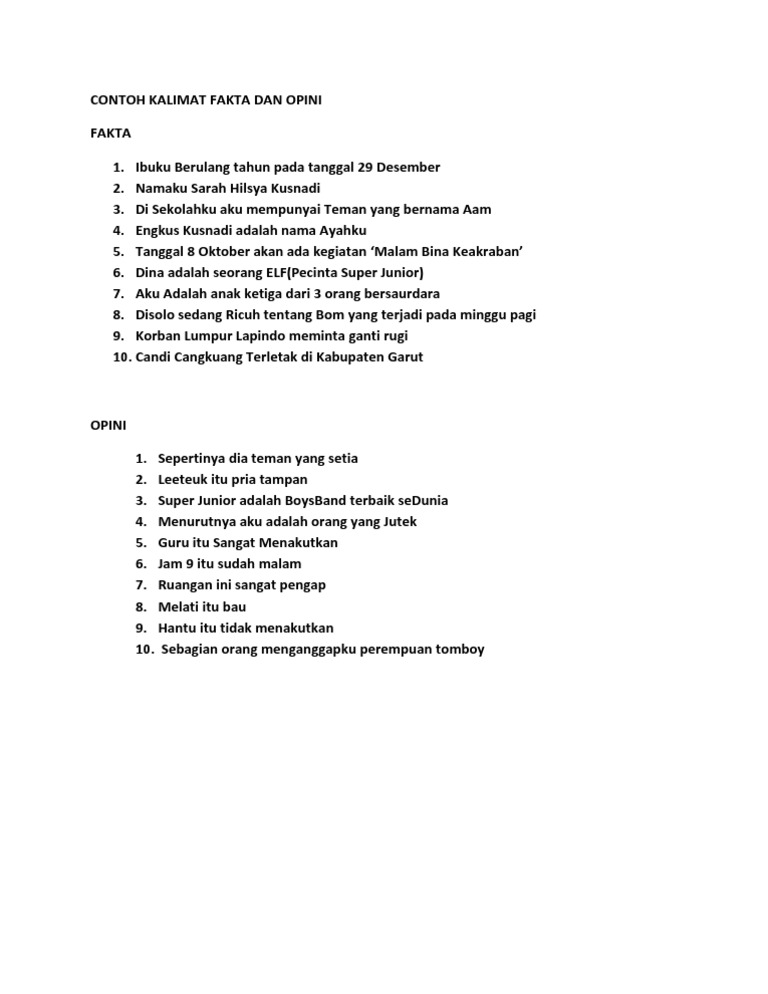 Di bawah ini terdapat contoh dan informasi tentang kalimat fakta dan opini. Kebebasan berpendapat dijamin secara konstutisional dalam uud 1945 pasal 28 bahwa kebebasan berserikat dan berkumpulmengeluarkan pikiran dnegan lisandan tulisan dan sebagaimana ditetapkan dengan undang undangpengertian kemerdekaan mengeluarkan pendapat dinyatakan dalam pasal 1 1 uu no. Contoh kalimat fakta dan opini dalam bahasa indonesia dalam bahasa indonesia dikenal istilah fakta dan opini. Contoh paragraf fakta donald trump terpilih menjadi presiden amerika serikat ke 45 setelah memenangkan pemilihan umum yang dilangsungkan pada hari selasa 8 november 2016 waktu setempat. Sebagai pelengkap penjelasan tersebut juga dilengkapi dengan contoh contoh opini beserta strukturnya dengan berbagai macam pilihan tema seperti lingkungan pendidikan kesehatan opini publik contoh fakta dan opini dalam koran dan berita dan masih banyak lagi. Fakta dan opini ini seringkali ditemukan dalam sebuah pemaparan suatu berita atau informasi.