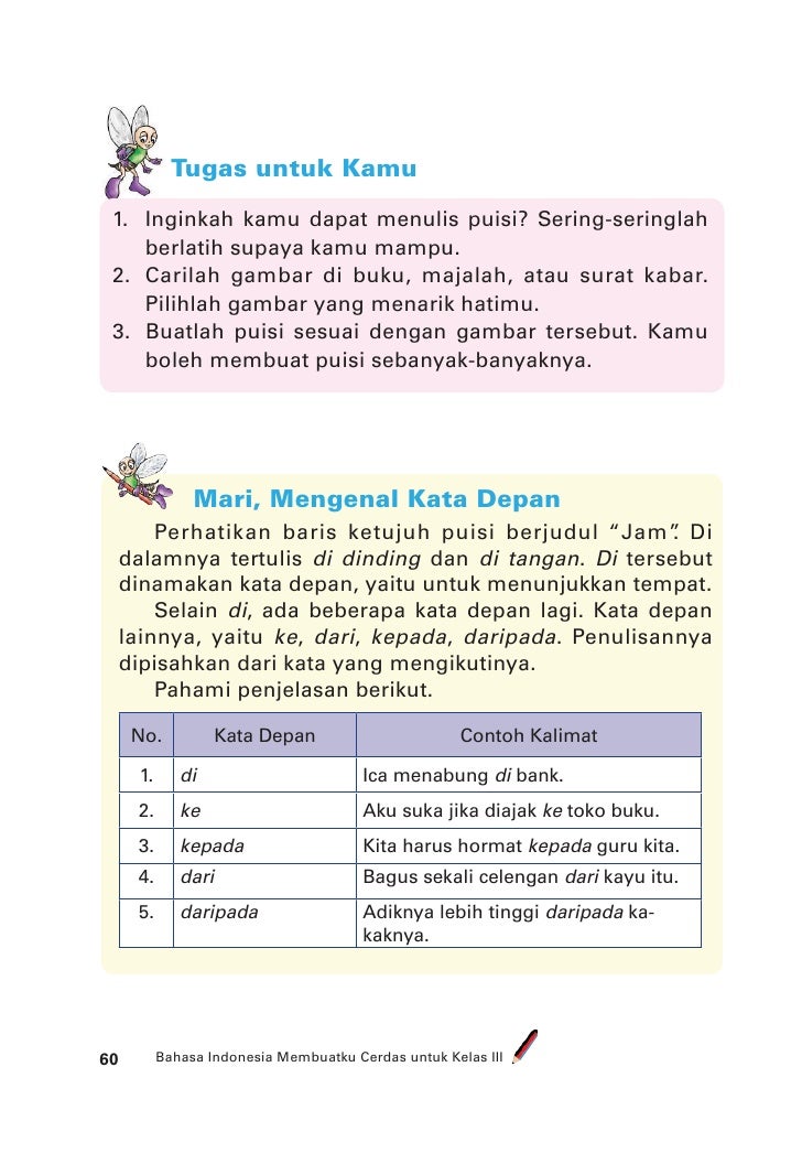 Sebagai contoh jika sebuah kalimat memiliki beberapa kata dengan imbuhan me maka kata kata lain yang digunakan dalam kalimat yang sama harus menggunakan imbuhan yang sama pula. Contoh kalimat menggunakan preposisi dari dan daripada akan tetapi pada materi ini kalian hanya akan dilatih untuk menggunakan preposisi kata depan dari dan daripada. Salah satu fungsi kata depan adalah sebagai penanda tempat. Ingin belajar kata depan bahasa inggris seperti in on at of to by before after for since under between among beside next to with dan mencari contoh preposition beserta kalimatnya. In of dan too. Antara puisi asmaradana karya goenawan mohamad dan cerita rakyat damarwulan memiliki persamaan.