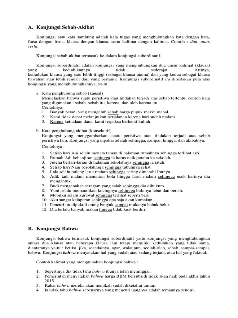 Contoh kalimat konjungsi subordinatif. Ayah selalu mengarahkan anak anaknya supaya menjadi anak yang sholeh dan sholehah. Adalah konjungsi yang menghubungkan dua klausa atau kalimat yang menerangkan adanya hubungan pengandaian. Penghubung ini berfungsi untuk menghubungkan satu klausa dan klausa lain dalam satu kalimat tersebut. Dank arena klausa utama dan klausa bawahan dapat saling bertukar posisi maka konjungsi penyungguhan ini dapat berada pada awal kalimat dapat juga ditengah kalimat. Pada konjungsi intrakalimat atau antar klausa ini terdapat 2 jenis kata penghubung atau konjungsi yakni konjungsi koordinatif dan konjungsi subordinatif. Pabrik mercon meledak secara tiba tiba sehingga menyebabkan para pekerjanya tidak.