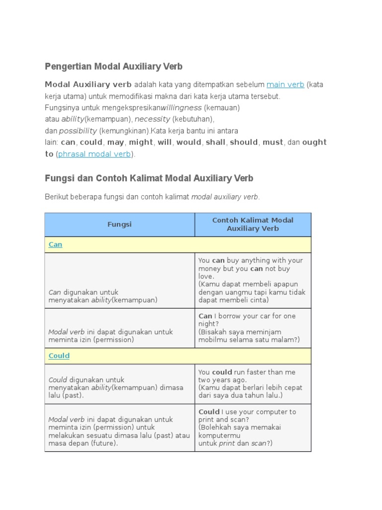 Dalam contoh kalimat kedua terdapat modal auxiliary have dan main auxiliary been yang diikuti dengan verbing driving. Contoh kalimat auxiliary verb berikut adalah beberapa contoh auxiliary verbs dan frase kata kerja. Kata kerja bantu ini antara lain. Modal auxiliary verbs atau sering dikenal juga dengan istilah secondary auxiliary verbs merupakan kata kerja bantu yang memberikan arti tambahan pada main verbs dalam kalimat. Fungsinya untuk mengekspresikan willingness kemauan atau ability kemampuan necessity kebutuhan dan possibility kemungkinan. Sebelumnya apakah sahabat sbi masih ingat yang di sebut dengan modal auxiliary verb itu seperti apa ya.