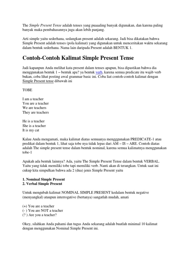 Contoh 24 toba lake is the largest lake in indonesia. Di bawah ini adalah beberapa contoh kalimat simple present tense yang menggunakan to be. Simple present tense pengertian simple present tense adalah suatu bentuk tense yang menerangkan pekerjaan atau kejadian yang terjadi saat ini. Keterangan waktu yang sedang dibahas saat ini yaitu keterangan waktu pada masa sekarang atau simple present tense. Areamis disebut kalimat nominal. Rumus simple present tense.