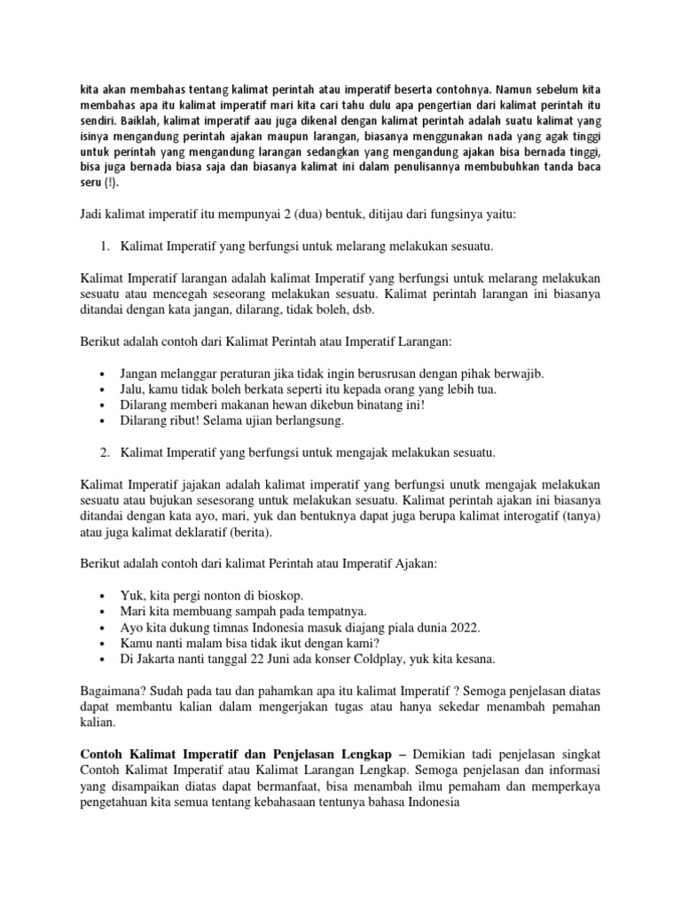 Contoh kalimat perintah ajakan. Kalimat ini ditunjukkan untuk menyampaikan suatu ajakan kepada seseorang ataupun sekelompok orang tertentu. Contoh kalimat ajakan dalam bahasa indonesia kalimat ajakan termasuk ke dalam jenis jenis kalimat perintah atau dapat dikatakan sebagai kalimat perluasan makna dari kalimat perintah. Ayo ikut aku ke bengkel sekarang. Ayo kita selesaikan pekerjaan ini sama sama. Kalimat perintah larangan ditujukan untuk melarang seseorang untuk berbuat sesuatu. Ayo selesaikan sekarang untuk.