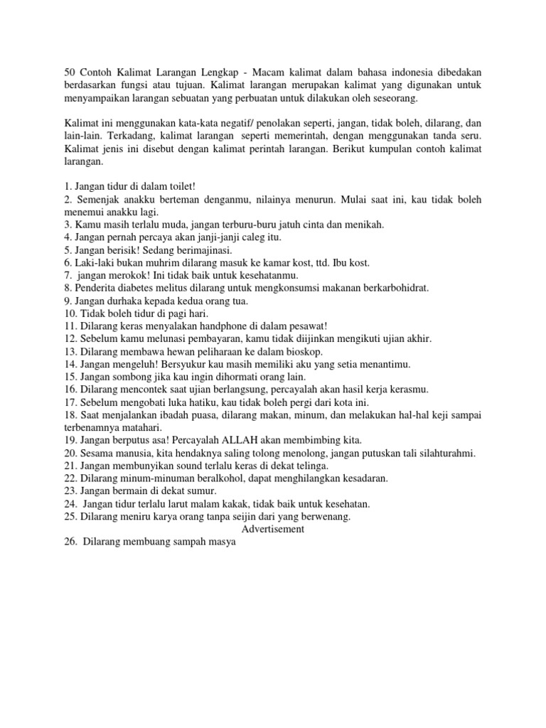 Nah itulah referensi kumpulan 100 contoh kalimat perintah baik kalimat perintah ajakan larangan permintaan bersyarat dan lain lain. Kalimat imperatif mengandung maksud memerintah atau meminta agar mitra tutur melakukan sesuatu sebagaimana diinginkan si penutur. Apa yang dimaksud dengan contoh kalimat perintah. Tujuan artikel ini dibuat untuk mempelajari semua hal tentang kalimat imperatif atau biasa disebut kalimat perintah mulai dari pengertian ciri ciri macam macam dan contoh kalimat perintahimperatif. Sekian contoh kalimat perintah kali ini semoga bisa membantu dan menjadi referensi bagi pembaca semua. Ciri kalimat perintah biasa adalah adanya kata kerja yang diimbuhi dengan akhiran lah atau kan.