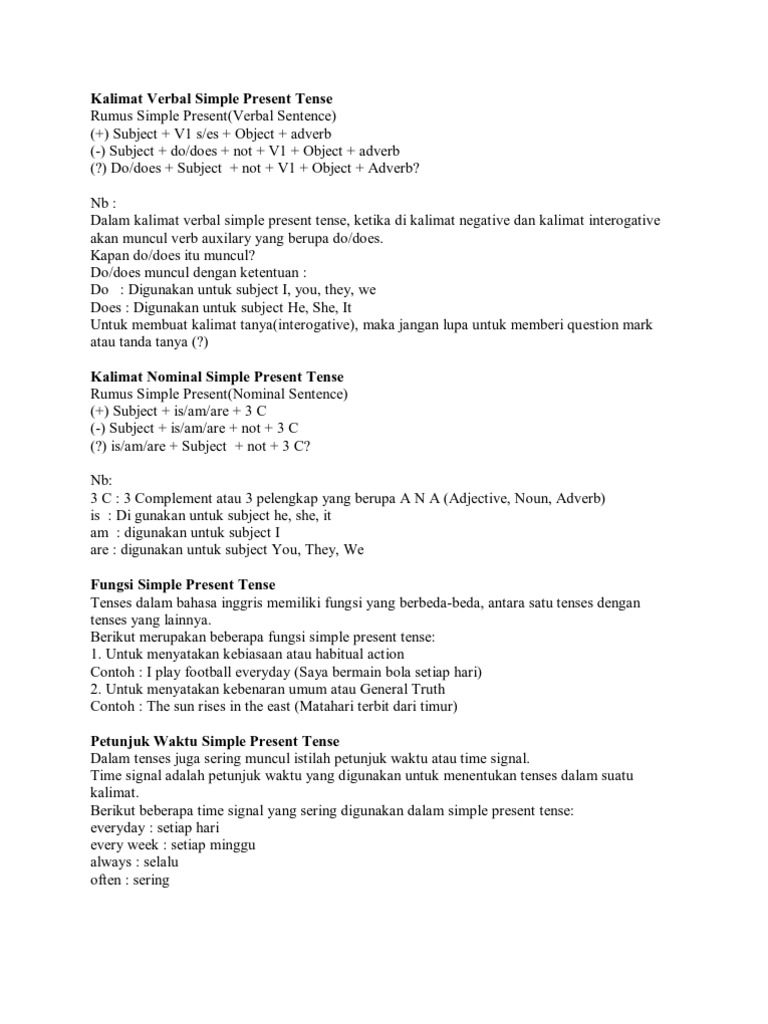 Contoh kalimat verbal dan nominal simple present tense. Murid murid tersebut bermain di halaman sekolah he got much money. Anyway simple present tense ini adalah tenses yang sangat sering dipakai dalam bahasa inggris. Contoh 24 toba lake is the largest lake in indonesia. Positif negatif dan introgatif. Rizki mengirimiku dua surat kemarin the students played at the school yard.