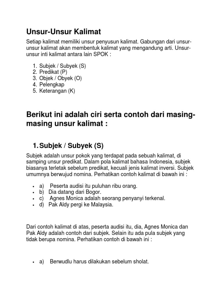 Elemen kalimat termasuk topik predikat objek informasi dan tambahan p. Kata depan apapun seperti sebagai ke dan di seharusnya tidak mengambil posisi subjek serta predikat. Contoh kalimat berpola spo adalah. Andi sebagai subjek membeli sebagai predikat dan buku sebagai objek. Dalam suatu kalimat terdiri dari beberapa unsur antara lain subyekpredikat obyek pelengkap dan keterangan. Contoh kalimat spok suatu kalimat yang baik dan benar akan memiliki unsur antara lain pelaku subjek s kata kerja predikat p yang dikenai pekerjaan objek o keterangan k hingga pelengkap p.