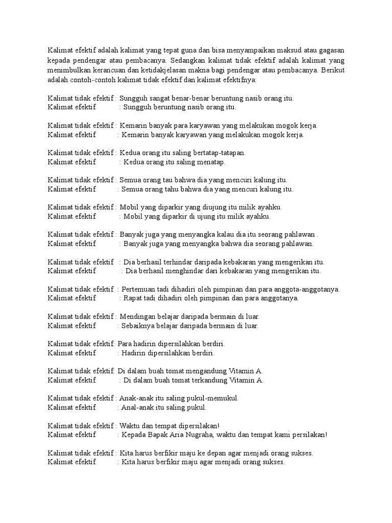 Contoh kalimat tidak efektif dalam paragraf. Oleh karena itu gunakanlah bahasa dan ejaan yang tepat agar kalimat yang kamu buat menjadi efektif. Contoh kalimat tidak efektif. Kalimat efektif tidak memakai kata kata berlebihan namun tidak juga kekurangan kata. Saya ini adalah mahasiswa universitas gajah mada kebetulan saya kontrak rumah di daerah stasiun tugujadi untuk pergi kuliah saya harus menggunakan transportasi umum yaitu trans jogjaselain saya. Aris membelikan pulsa kakaknya 2.