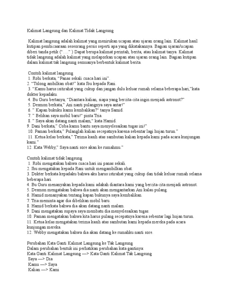 Untuk merubah kalimat tidak langsung menjadi kalimat langsung kita dapat menerapkan cara berikut contoh. Contoh kalimat langsung dan tidak langsung macam macam kalimat adalah pelajaran bahasa indonesia sangat beraneka ragam. Untuk merubahnya menjadi kalimat langsung yang harus kita lakukan menerka kira kira apa yang hilman bicarakan saat itu. Merubah kalimat tidak langsung menjadi kalimat langsung. Hilman mengatakan jika ia akan datang ke rumahku nanti sore. Untuk memahami tentang kalimat langsung maka perlu ketahui contoh kalimat langsung agar menambah wawasan dalam memahami kalimat langsung.