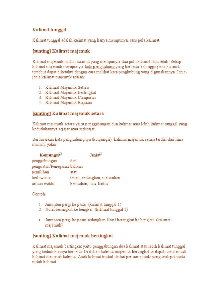 Dalam bahasa indonesia kalimat berarti kata atau rangkaian kata yang dapat berdiri sendiri dan dapat menyatakan makna atau gagasan secara lengkap dan utuh. Hubungan antarklausa tersebut ditandai dengan kata hubung konjungsi. Terdapat pola tertentu yang menjadi ciri khas dari kalimat ini. Ada 2 jenis kalimat setara yaitu. Contoh kalimat majemuk setara berlawanan. Contoh kalimat tunggal kalimat dalam bahasa indonesia di bagi menjadi dua yaitu kalimat mejemuk dan kalimat tunggalkalimat majemuk adalah suatu kalimat yang memiliki dua buah klausa atau lebih sedangkan kalimat tunggal adalah suatu kalimat yang paling sederahana dalam bahasa indonesia yakni dari jumlah pola kalimatnya.