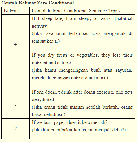 Conditional sentence type 0 adalah sebuah kalimat yang digunakan ketika hasil dari condition atau syarat terbentuk akibat dari scientific fact atau fakta ilmiah atau general truth kebenaran umum yang merupakan suatu kebiasaan. Conditional sentence tipe ini cocok digunakan untuk menyatakan mimpi dan angan angan. Tipe ini digunakan untuk mengatakan sesuatu yang sangat kecil kemungkinannya untuk terjadi atau dengan kata lain hampir tidak mungkin terjadi. Baca juga materi bahasa inggris lainnya. Contoh conditional sentence type 2. If i work hard i will have a lot of money.