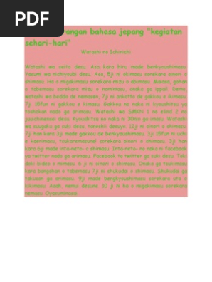 Contoh karangan bahasa jepang beserta artinya. Contoh karangan dalam bahasa jepang. Contoh jurnal inilah karangan bahasa jepang tentang hobi beserta artinya yang anda perlukan. Bagi sobat yang ingin mengetahui pembahasan tentang text recount mulai dari pengertian purpose social funtion dan generic structurenya silahkan klik di sini. Semua murit tidak boleh datang terlambat. Belajar nya pun menjadi semangat. Setiap hari saya belajar di lpk.