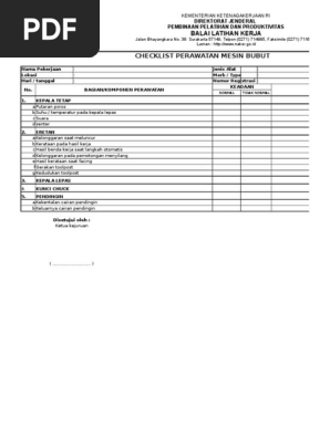 Contoh format checklist perawatan mesin. Selain itu perawatan mesin produksi betujuan untuk memperpanjang usia pakai dari mesin itu sendiri. Banyak keuntungan saat kita memiliki kartu tersebut antara lain. Kita mempunyai jadwal perawatan sehingga kita tidak repot mengatur jadwal yang diluar angan angan. Contoh form jadwal pokok pemeliharaan mesin. Bila terjadi kerusakan sudah dapat kita prediksi kerusakannya di bagian mana.