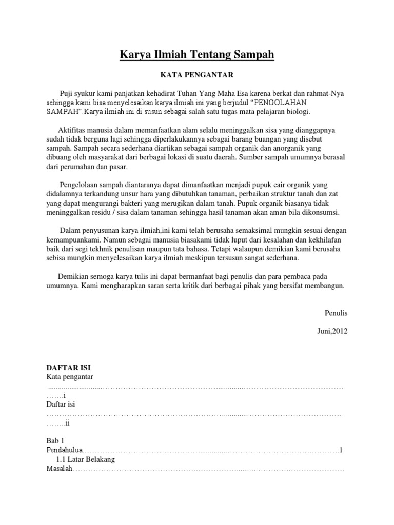Setelah pembaca mengetahui tentang bahaya sampah kami sarankan untuk pembaca agar selalu menjaga kebersihan lingkungan dari sampah. Download kumpulan contoh karya tulis ilmiah sederhana singkat populer formal dan semi formal remaja bahasa indonesia terbaru 2020. 11 latar balakang pemilihan judul. Berikut ini akan kami berikan contoh karya tulis ilmiah yang baik dan juga benar. Academiaedu is a platform for academics to share research papers. Contoh karya ilmiah remaja biologi pendidikan tentang sampah dan sederhana pengertian contoh karya ilmiah adalahberikut ini jenis contoh karya ilmiah.