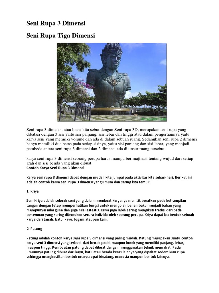 Seni rupa 2 dimensi adalah seni rupa yang dibatasi oleh panjang dan lebar. 10 contoh karya seni rupa 3 dimensi dan 2 dimensi. Seni patung merupakan cabang seni rupa murni yang karyanya berbentuk tiga dimensi. Karya seni rupa 3 dimensi dengan mudah kita temukan dalam kehidupan sehari hari. Bahkan sebuah karya seni yang sudah sangat tua bahkan berumur ratusan tahun harganya mencapai milyaran. Berikut ini contoh karya seni rupa 3 dimensi yang biasa kita temukan.