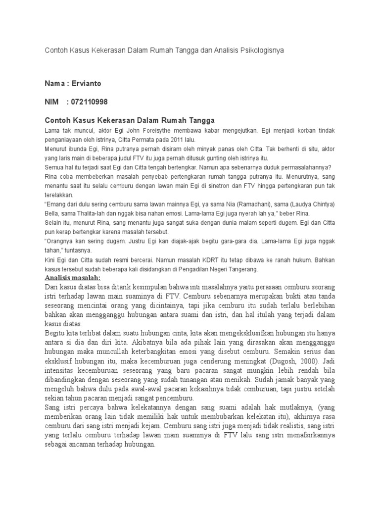 Contoh kasus kdrt dan analisisnya. Kekerasan dan atau ancaman kekerasan fisik seksual dan ekonomis. Berdasarkan analisa terhadap semua kasus di semua wilayah ntb kecuali di kota mataram dapat dikatakan pelaku dan korban 100 persen merupakan orang miskin. Perikatan dalam hal ini berarti. Semoga artikel ini dapat memberikan pelajaran bagi kita semua. Hal ini juga diikuti oleh kesadaran dari korban untuk melaporkan kepada aparat hukum atau lembaga yang memiliki kepedulian tinggi terhadap kasus kekerasan rumah tangga anak dan perempuan. Ia merasa menjadi tawaan yang tidak bebas lagi berkumpul dengan teman teman.