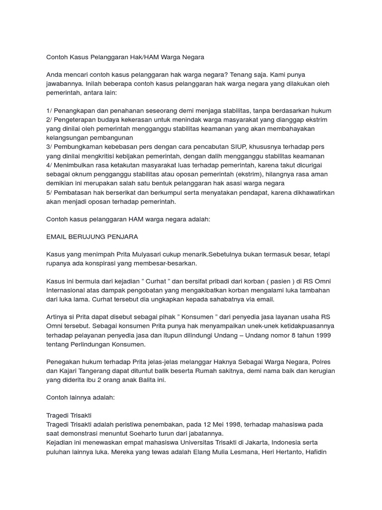 Sepanjang tahun 2018 terdapat sebanyak 451 kasus pelanggaran di bidang pendidikan yang diterima kpai. Beberapa contoh ham misalnya yaitu hak hidup hak beragama dan hak berkeyakinan. Faktanya meski pemerintah telah menjamin hak warganya masih sering terjadi kasus kasus pelanggaran ham di indonesia. Pelanggaran ham peristiwa trisakti dan semanggi 2. Contoh kasus pelanggaran ham di indonesia ham atau hak asasi manusia adalah hak dasar yang dimiliki oleh semua orang sejak lahir.