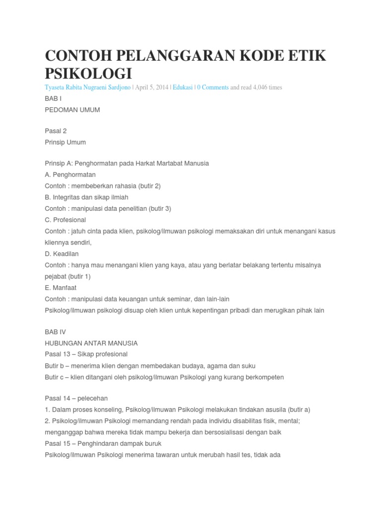 Contoh kasus kedua merupakan kasus yang sebenarnya telah terekspos agak lama. Pada tahun 1997 david. Kode etik psikologi indonesia. Bagi seorang psikolog atau ilmuwan psikologi yang melakukan plagiarism berarti telah melakukan pelanggaran terhadap pasal 15 kode etik psikologi indonesia. Setelah beberapa bulan dari kelulusannya ia direkrut menjadi dosen di sebuah sekolah tinggi di salah satu lembaga pendidikan di tempat tinggalnya. Kasus pelanggaran kode etik psikologi posted by andini pritanias own at 1421.