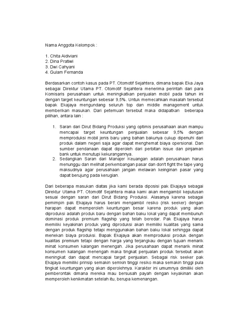 Gaya pengambilan keputusan yang diterapkan adalah manajer mengambil keputusan sendiri berdasarkan masukan informasi yang diterima. Tou 2 strategi pengambilan keputusan dan contoh kasus strategi pengambilan keputusan dalam organisasi. Pengambilan keputusan decision making merupakan salah satu proses manajemen yang penting bagi setiap organisasi. Definisi keputusan seperti yang sudah dijelaskan diatas keputusan adalah reaksi terhadap beberapa solusi alternatif yang dilakukan secara sadar dengan cara menganalisa kemungkinan kemungkinan dari alternatif tersebut bersama konsekuensinya. Dalam kasus seperti ini konsumen secara aktif mencari informasi untuk mengevaluasi dan mempertimbangkan pilihan beberapa merek dengan menetapkan kriteria tertentu seperti kemudahan dibawa dan resolusi untuk sistem kamera elektronik dan untuk mobil adalah hemat daya tahan tinggi. Contoh kasus analisis pengambilan keputusan pada perusahaan bachtiar husain.
