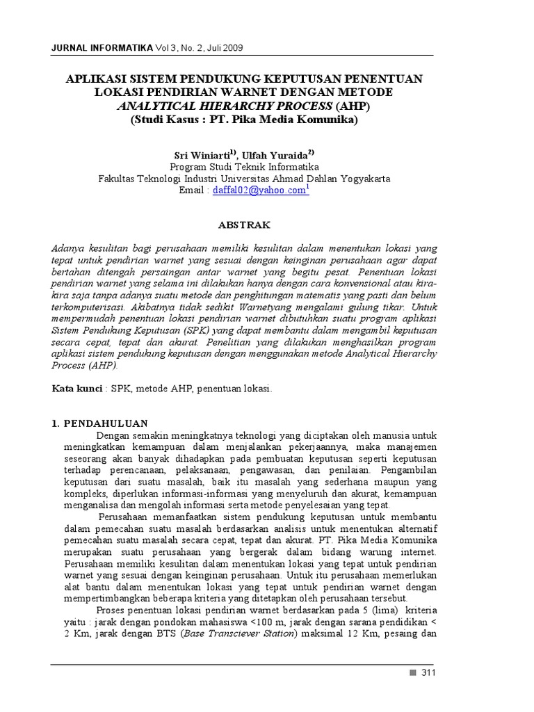 Contoh kasus spk dengan metode ahp. Contoh perhitungan sistem pendukung keputusan pemberian beasiswa dengan menggunakan metode simple additive weghting saw. Contoh aplikasi spk metode ahp sistem pendukung keputusan ini membantu pengambil keputusan dalam menyeleksi alternatif dengan membandingkan setiap alternatif pada setiap kriteria metode yang digunakan adalah ahp analityc hierarchy process. Contoh kasus ahp pemilihan tas wanita dengan 3 kriteria yaitu. Penyelesaian masalah dengan ahp step by step menggunakan ahp dalam mengambil sebuah keputusan. Menurut suryadi 1988 pengertian dari pakar dalam model ahp adalah bukan orang yang jenius pintar bergelar doctor. Pada sistem pendukung keputusan metode ahp ini kami mengambil contoh studi kasus untuk memilih karyawan terbaik dengan beberapa kriteria kejujuran.