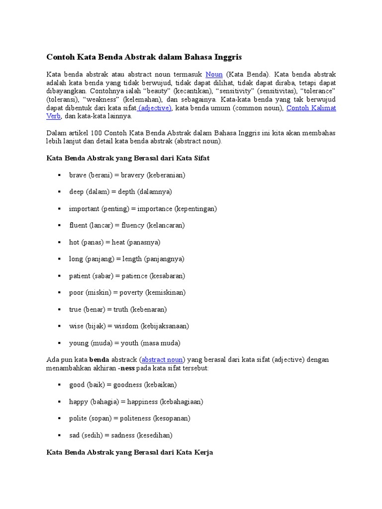 Dalam mempelajari bahasa inggris atau bahasa apapun. Pengertian contoh kata abstrak dan kata konkret dalam bahasa indoensia terdapat banyak beberapa golongan kata salah satunya adalah kata abstrak dan kata konkret. Walau hanya sekilas saja pembahasannya mudah mudahan bisa bermanfaat untuk kita yang sedang belajar menganai tata bahasa indonesia. Kata benda turunan adalah kata benda yang mendapat penambahan imbuhan baik berupa awalan akhiran sisipan atau awalan akhiran yang disebut dengan afiksasi. Kata kata benda yang tak berwujud dapat dibentuk dari kata sifat kata benda umum common noun contoh kalimat verb dan kata kata lainnya. Ada banyak sekali kata benda abstrak berikut ini adalah contoh contoh kata benda abstrak berupa kata dasar maupun kata berimbuhan.