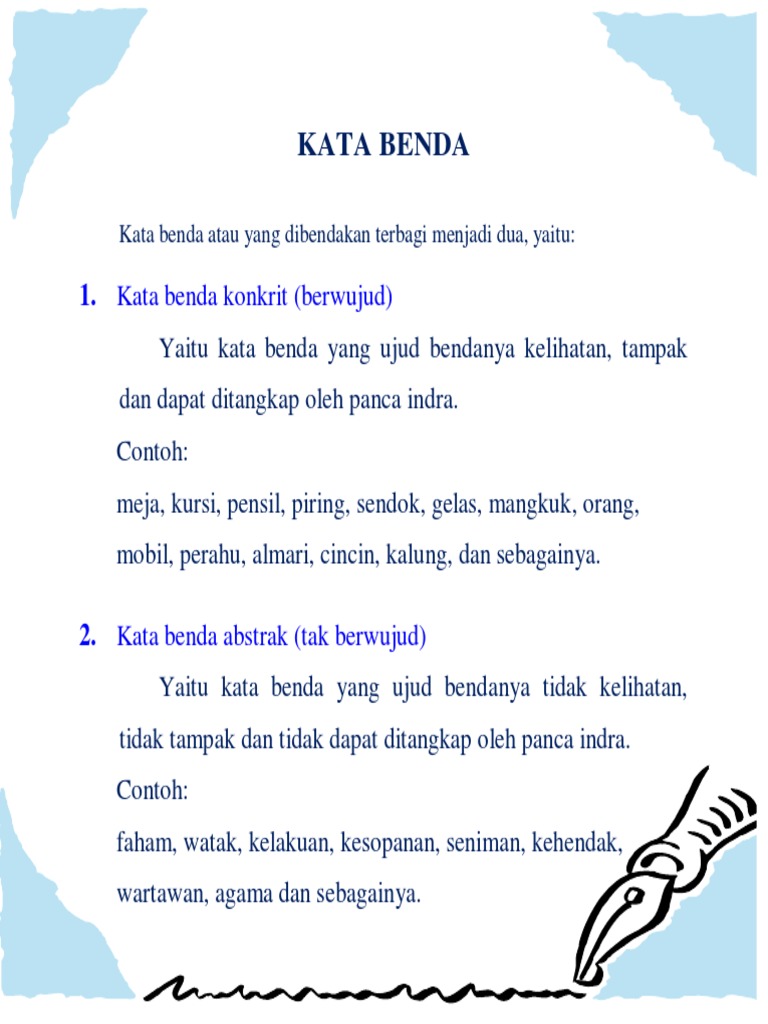 Kata benda dalam bahasa inggris kata benda adalah kata yang menyatakan orang tempat hewan benda dan segala yang dibendakan pikiran panca indera profesi dan lain sebagainyacontoh dari kata benda misalnya buku perpustakaan meja dsb. Kata benda ini merupakan kata yang menjelaskan benda yang abstrak atau tidak bisa dilihat dengan indera penglihatan.