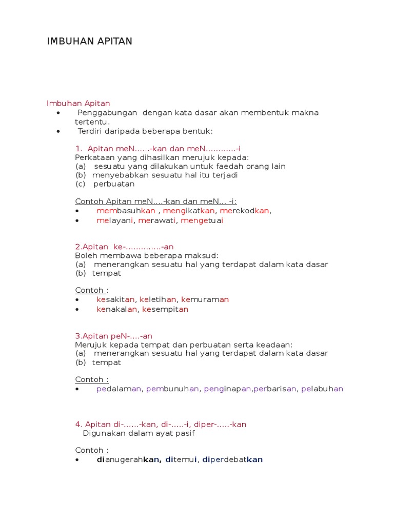 Ada beberapa jenis imbuhan ini diantaranya kan i. Imbuhan sendiri mempunyai beberapa macam di mana tiga diantara macam macam imbuhan tersebut antara lain imbuhan awalan prefiks sisipan infiks dan akhiran konfiks. Makna ayat contoh 1. Getar er gemetar tali el temali. Akhiran suffiks imbuhan ini diletakkan pada bagian akhir kata dasar. Untuk membentuk kata kerja tak transitif daripada kata kata lain.