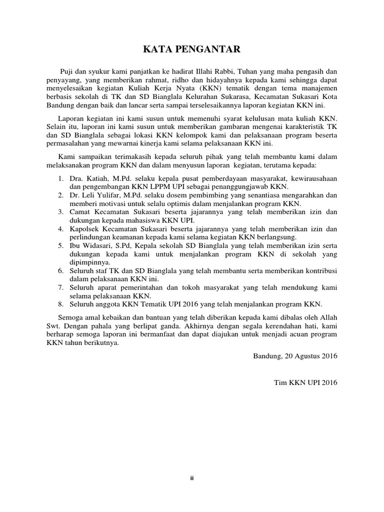 Contoh kata pengantar ketika kamu menyusun laporan makalah atau skripsi maka perlu ada kata pengantar sebagai salah satu bagian pelengkap susunan sebuah karya tulis ilmiah baik itu merupakan tugas dari kampus maupun tingkat sekolah menengah. Puji syukur alhamdulillah kami panjatkan ke hadirat tuhan yang maha esa yang sudah melimpahkan nikmat taufik dan hidayah nya yang sangat besar sehingga kami pada akhirnya dapat menuntaskan laporan kegiatan laporan kegiatan sekolah model tepat dengan waktunya. Laporan ini merupakan laporan kegiatan pelatihan guru mipa smp sma se provinsi papua barat yang dilaksanakan tanggal 11 januari 2010 sampai dengan tanggal 15 januari 2010 bertempat di hotel billy jaya manokwari papua barat. Sayangnya pembuatan kata pengantar kadang kadang diremehkan dan dianggap sepele bahkan dalam penulisannya masih banyak yang dangkal. Kata pengantar adalah tulisan wajib yang harus ada dalam sebuah laporankarena itu ketentuan untuk membuat laporan dengan baik dan benar. Bapak ibu guru smk n 1 jaranan yang telah membina dan mengarahkan kami selama kunjungan industri.