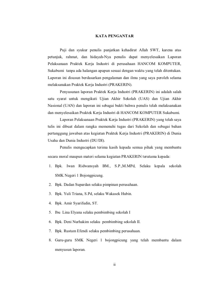 Kata pengantar assalamualaikum wrwb puji syukur ke hadirat tuhan yang maha kuasa yang telah melimpahkan anugerah dan perkenan nya sehingga kami dapat menyelesaikan laporan praktek kerja lapangan pkl untuk memenuhi syarat mengikuti ujian nasional di smk kesehatan parigi. Ketika seseorang sudah menyelesaikan tugas magang di industri mereka tentu akan diminta untuk membuat sebuah laporan yang digunakan sebagai bukti bahwa yang bersangkutan benar benar menyelesaikan tugas magangnya. Contoh kata pengantar laporan bagi mahasiswa dan pelajar membuat kata pengantar untuk tugas laporan adalah hal yang sangat penting. Pada umumnya kata pengantar biasa digunakan dalam membuat sebuah proposal skripsi laporan dan bahkan dalam pembuatan surat. Contoh kata pengantar laporan pkl untuk anda yang telah menyelesaikan laporan pkl praktek kerja lapangan dibawah ini kami berikan sebagai contoh. Kata pengantar puji syukur penulis ucapkan kehadirat tuhan yang maha esa yang telah melimpahkan rahmat dan hidayah nya sehingga dapat menyelesaikan penyusunan laporan praktik kerja industri di pt.