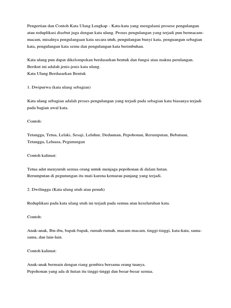 Kata ulang utuh penuh seluruh contoh. Reduplikasi dengan mendapat imbuhan baik pada lingga pertama maupun pada lingga kedua. Proses pembentukan pengulangan kata dapat terjadi dengan berbagai cara. Jenis kata ulang yang satu ini ialah kata yang mengalami suatu proses pengulangan seluruhnya tetapi tidak bisa dipisahkan misalnya pada kupu kupu laba laba umang umang pura pura lain sebagainya. Definisi dan contoh kata ulang kata ulang adalah kata yang tereduplikasi artinya kata tersebut mengalami pengulangan dengan maksud dan tujuan tertentu. Untuk membedakannya dari transformasi yang bukan reformulasi kata transformasi harus memiliki kata dasar sebagai karakteristik utama.