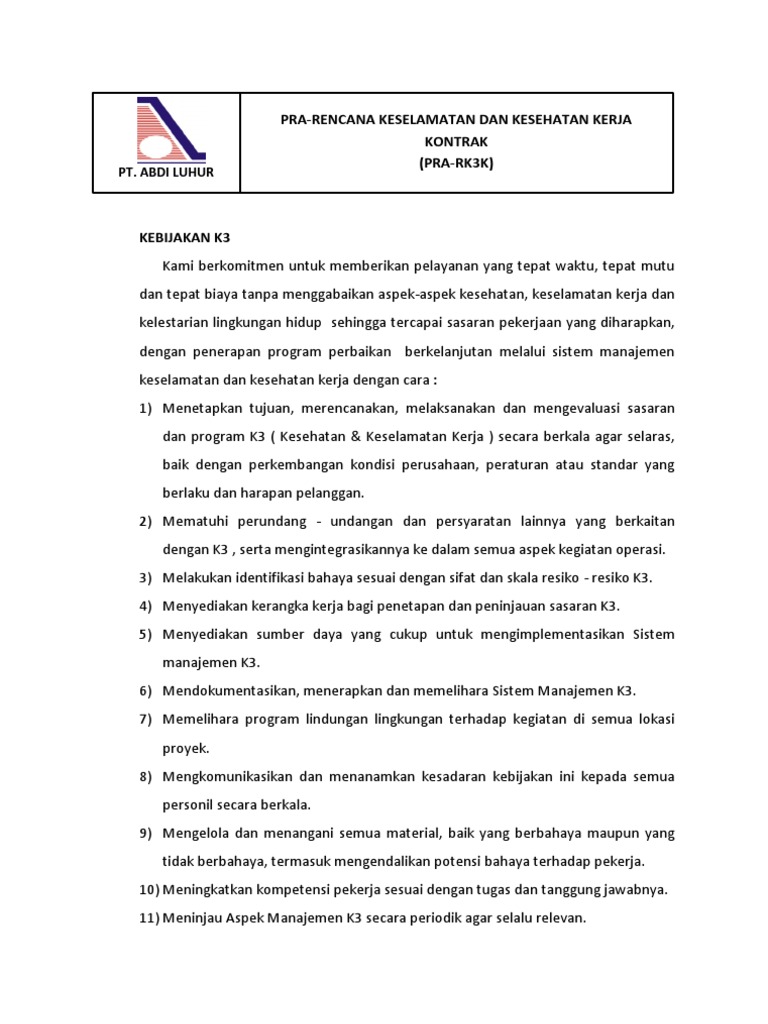 50 perusahaan telah membuat kebijakan k3 yang tertulis pada 2010. Pdf contoh kebijakan perusahaan tentang lingkungan. Smk3 adalah sistem manajemen yang terintergrasi untuk menjalankan dan mengembangkan kebijakan k3 yang telah ditetapkan perusahaan serta menanggulangi resiko bahaya yang mungkin terjadi di perusahaan. Tanggung jawab untuk kesesuaian di dalam pengelolaan perusahaan terhadap peraturan perundang undangan yang berlaku dan prinsip prinsip perusahaan yang sehat. Kebijakan k3 tentu berbeda antara satu perusahaan dengan perusahaan lain tergantung jenis bahaya yang ada dalam sebuah perusahaan tersebut. Prosedur k3 dapat disimpulkan beberapa hal sebagai berikut.