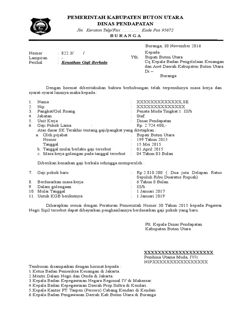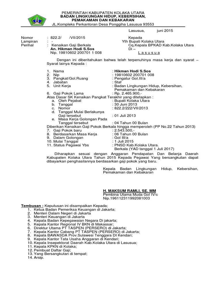 Unduh file disini baca selengkapnya. Atas dasar surat keputusan terakhir tentang gaji pangkat yang telah. Contoh sk gaji berkala dinas dikpora kabupaten lombok tengah. Diberikan kenaikan gaji berkala sehingga memperoleh. Masa kerja golongan. Contoh format kenaikan gaji berkala posted by unknown on wednesday january 28 2015 pemerintah kabupaten bombana kantor pelayanan perizinn terpadu kabupaten bombana alamat.
