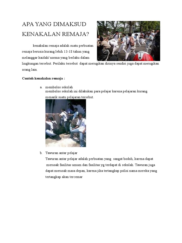 Berikut kenakalan warganet di bangku sma yang bikin kita rindu masa remaja. Kenakalan remaja di sekolah. Contoh kenakalan remaja di sekolah 1819 unknown kenakalan remaja merupakan gejala umum khususnya terjadi di kota kota besar yang kehidupannya diwarnai dengan adanya persaingan persaingan dalam memenuhi kebutuhan hidup baik yang dilakukan secara sehat maupun secara tidak sehat. Secara teoritis keutuhan keluarga dapat berpengaruh terhadap kenakalan remaja. Kenakalan remaja saat ini memang sudah banyak terjadi. Pengertian ciri contoh penyebab dan solusinya lengkap dalam kehidupan sehari hari kita sering sekali melihat kenakalan remaja misalnya tawuran antar sekolah tawuran antar sekolah merupakan salah satu dari kenakalan remajapada kesempatan kali ini disini akan mengulas tentang kenakalan remaja secara lengkap.